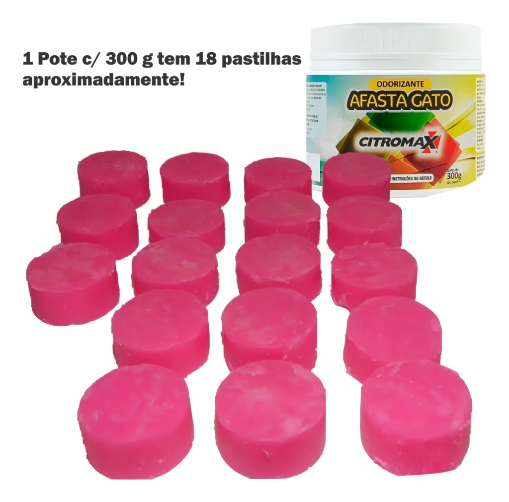 AFASTA GATO da marca Citromax 300gr é um produto natural para afastar gatos. Sua eficácia se deve a ingredientes vegetais puramente aromáticos, combinados com um granulado natural à base de amido. O odor persistente do AFASTA GATO afasta os gatos de forma eficaz, sem causar-lhes danos, mascarando as marcações territoriais e fazendo com que evitem o território protegido. O produto é percebido apenas por gatos e não afeta cães, podendo ser utilizado em casas, quartos, muros, pátios, veículos, entre outros.