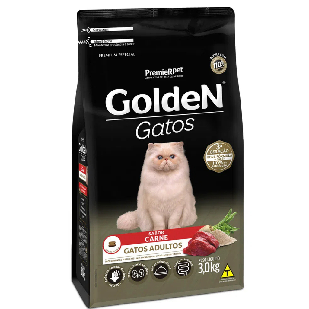 A Ração Golden Gatos Adultos Carne é tudo que seu gato precisa para ficar diariamente satisfeito.
